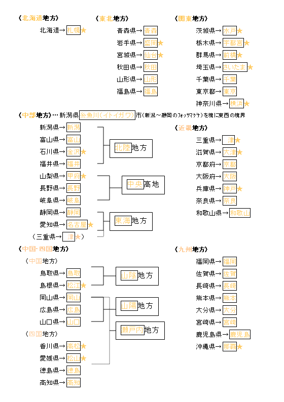 (注:プリント内の★つきは県名と県庁所在地が違うってことです)